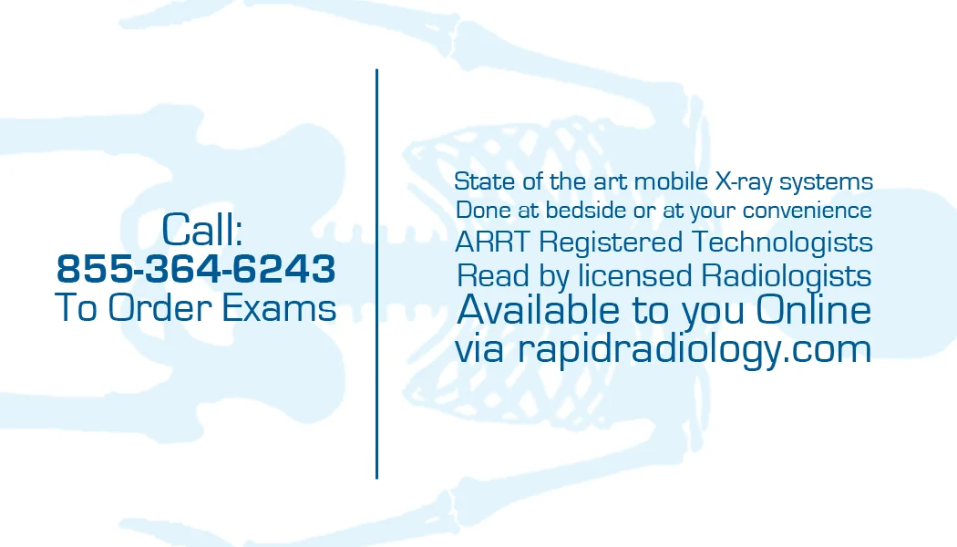 Digital x-ray is the latest and most advanced generation of diagnostic radiography equipment. This technology, also known as direct radiography, dramatically outclasses its predecessors in all areas including dose, exam time, and image quality. The compactness and versatility of its design allows us to manuaver through tight cooridors and perform exams in homes, patient rooms, exam rooms, etc. Our exams are typically completed in moments with images viewable on the x-ray console seconds after exposure and transmitted wirelessly to be read by a licensed radiologist.